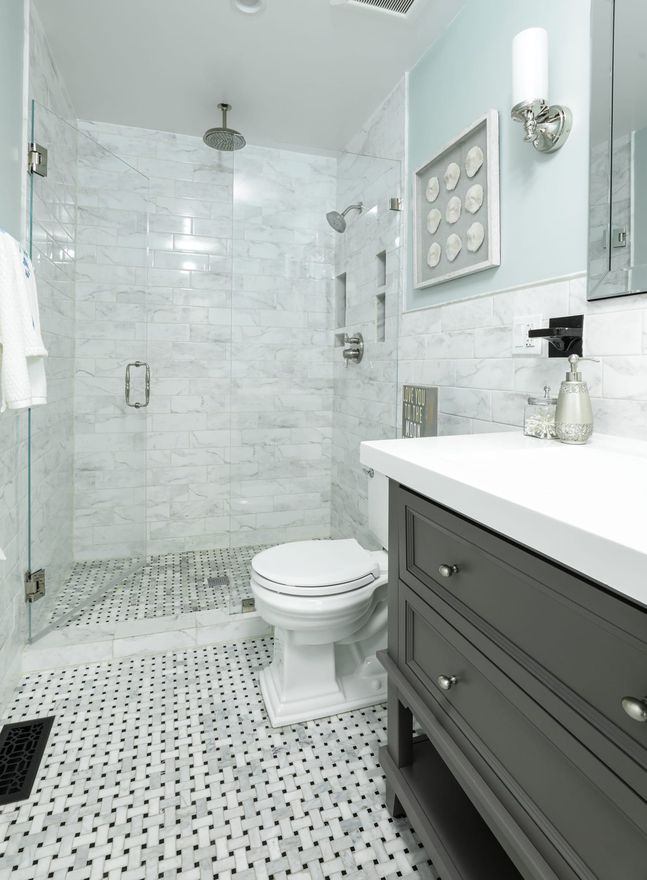 - Primary bedroom suite has a customized walk-in closet, drum and recessed lighting, and sliding glass doors to the rear deck and yard; the remodeled en suite bath has basketweave marble floor, Carrara marble finishes, including subway-set wainscot, a frameless glass shower with ceiling rainspout and fixed sprays, plus tub with hand-held spray