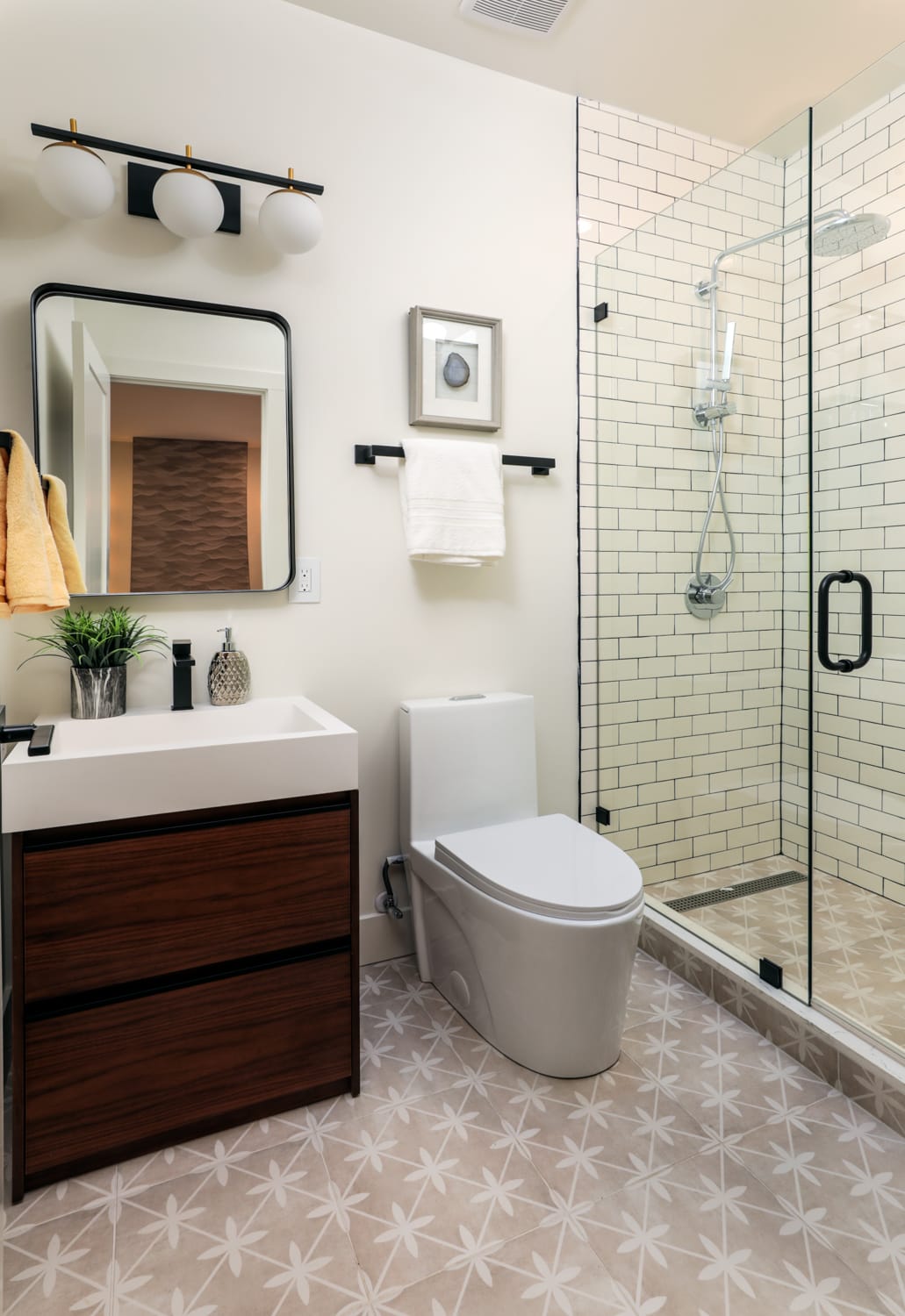 - Two additional bedrooms are served by a bath with encaustic tile floor, skylight, and frameless-glass shower surrounded in subway-set tile